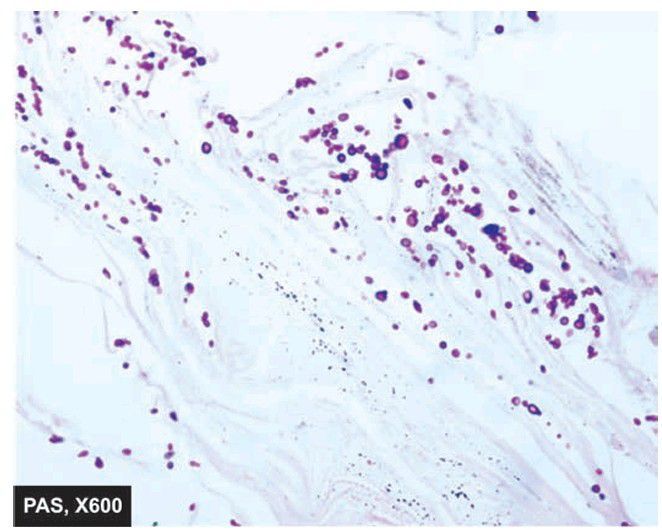 The stratum corneum around the hair follicle shows presence of numerous arthrospores and hyphae.