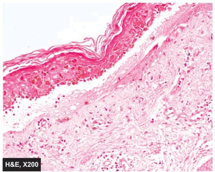 There is pronounced dermoepidermal interface dermatitis. There is oedema and necrosis of kertinocytes at the junction and mild lymphocytic infiltrate.