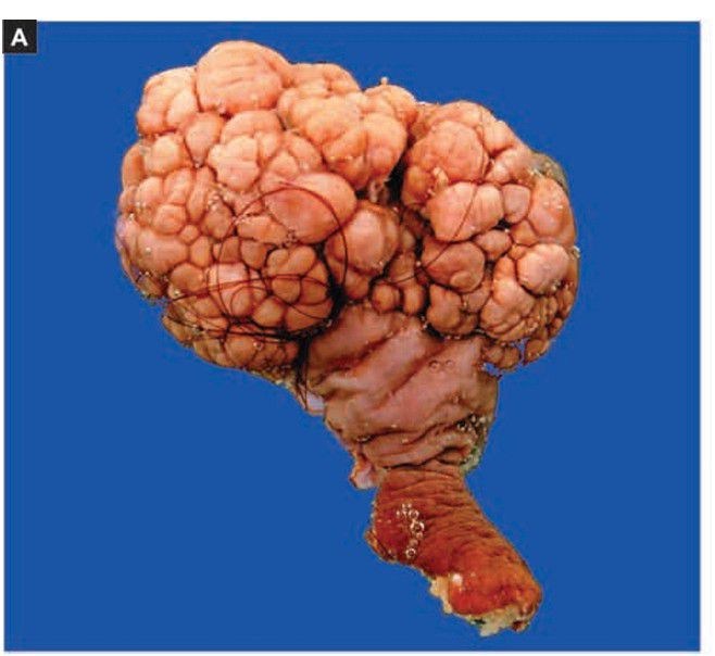 The skin surface shows a papillary growth with a pedicle while the surface is smooth.