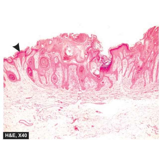 The border of the elevated lesion at the lateral margin is in a straight line from the normal uninvolved epidermis (arrow). The other features include papillomatosis, hyperkeratosis and acanthosis.