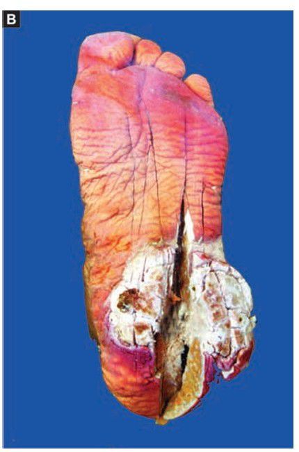 The skin surface on the sole of the foot shows a fungating and ulcerated growth. On cutting, the growth is both exophytic and endophytic and is chalky white in colour.