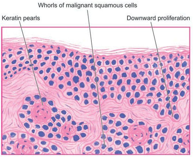 Microscopic features of well-differentiated squamous cell carcinoma.
