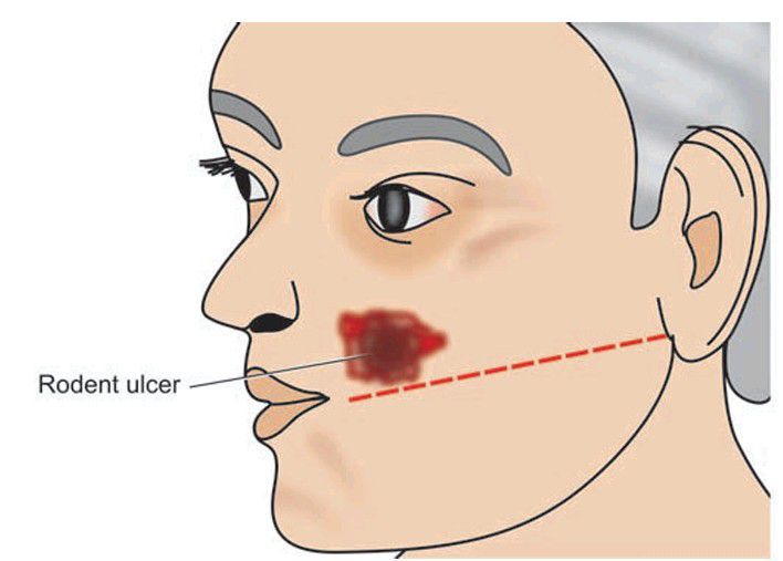 Common location and macroscopic appearance of basal cell carcinoma (rodent ulcer).