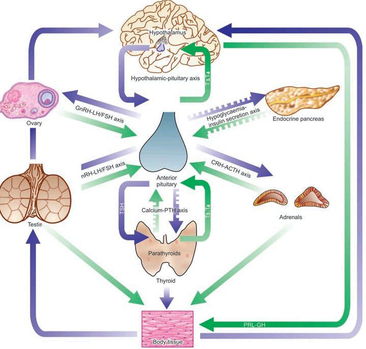 Endocrine organs and the presence of feedback controls. Both positive and negative feedback controls exist for each endocrine gland having a regulating (R) and stimulating (S) hormone. Those acting through hypothalamic-pituitary axis include: thyroid hormones on TRHTSH axis, cortisol on CRH-ACTH axis, gonadal steroids on GnRH-LH/FSH axis and insulin-like GH on GHRH-GH axis. Those independent of pituitary control (shown by interrupted arrows) have also feedback controls by calcium on PTH, and hypoglycaemia on insulin release by pancreatic islets.