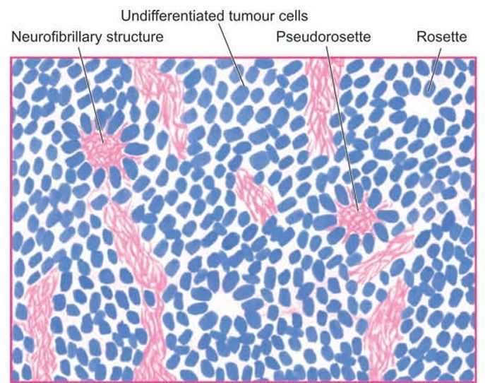 Neuroblastoma, It shows small, round to oval cells forming irregular sheets separated by fibrovascular stroma. A few HomerWright’s pseudorosettes are also present. Inset shows a close-up view of pseudorosette.