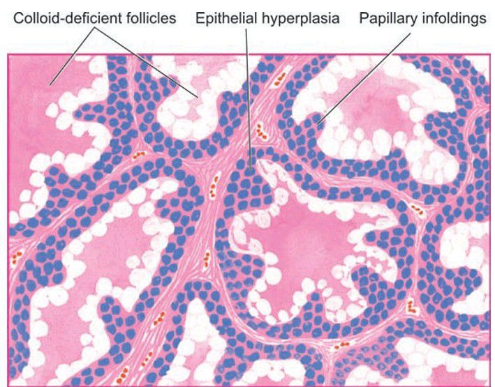 The follicles are small and are lined by tall columnar epithelium, which is piled up at places forming papillary infoldings. Colloid is nearly absent and appears lightly staining, watery and finely vacuolated.