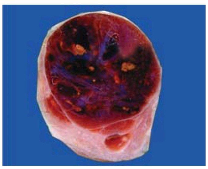 The thyroid gland is enlarged diffusely. Cut section shows lobules of translucent gelatinous light brown parenchyma and areas of haemorrhage.