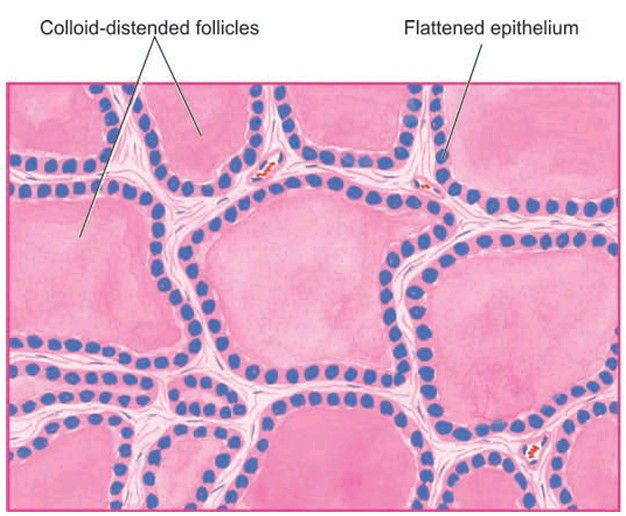 Microscopy shows large follicles distended by colloid and lined by flattened follicular epithelium.