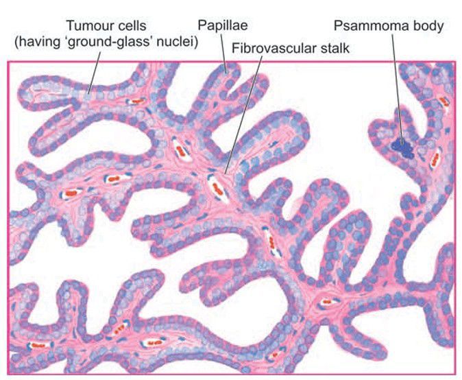 . Microscopy shows branching papillae having flbrovascular stalk covered by a single layer of cuboidal cells having ground-glass nuclei. Colloid-filled follicles and solid sheets of tumour cells are also present.