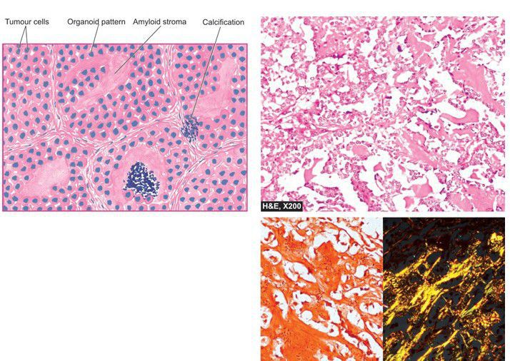 . Microscopy shows organoid pattern of oval tumour cells and abundant amyloid stroma. Amyloid shows congophilia which depicts apple-green birefringence under polarising microscopy.