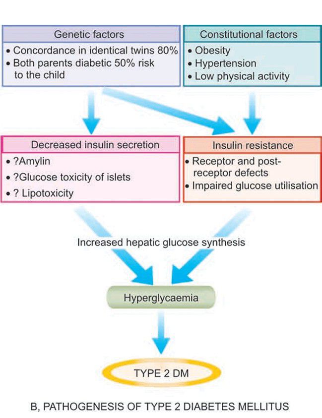 Schematic mechanisms involved in pathogenesis of two main types of diabetes mellitus.