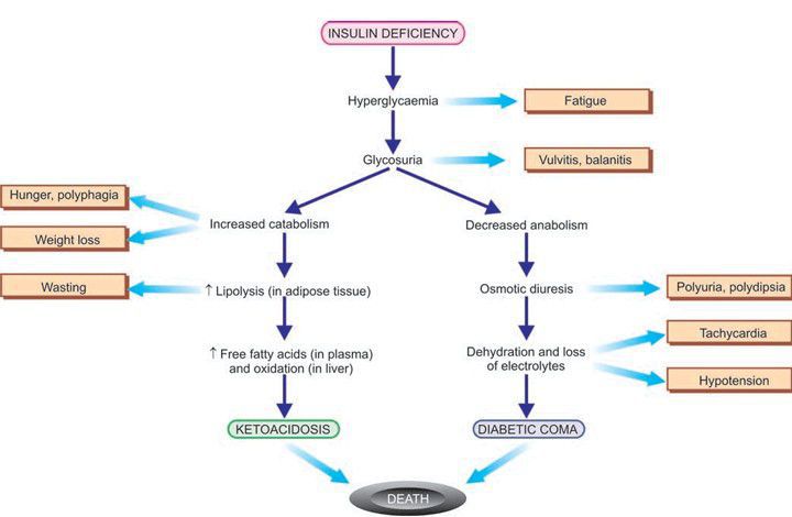 Pathophysiological basis of common signs and symptoms due to uncontrolled hyperglycaemia in diabetes mellitus.