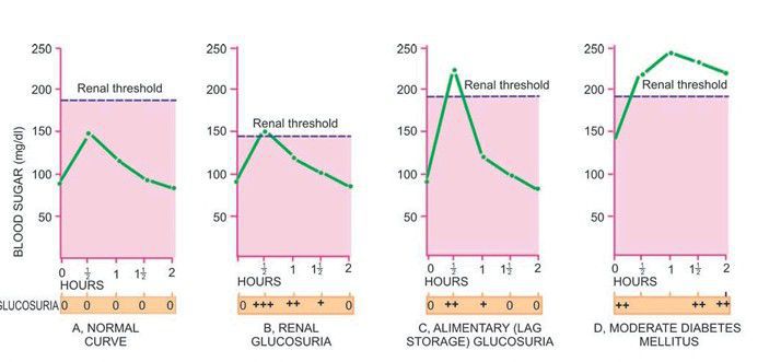 The glucose tolerance test, showing blood glucose curves (venous blood glucose) and glucosuria after 75 gm of oral glucose.