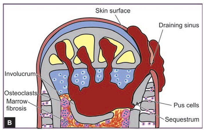 The abscess expands further causing necrosis of the cortex called sequestrum. The formation of viable new reactive bone surrounding the sequestrum is called involucrum. The extension of infection into the joint space, epiphysis and the skin produces a draining sinus