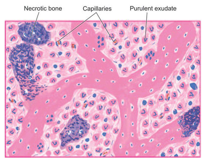 Histologic appearance shows necrotic bone and extensive purulent inflammatory exudate.