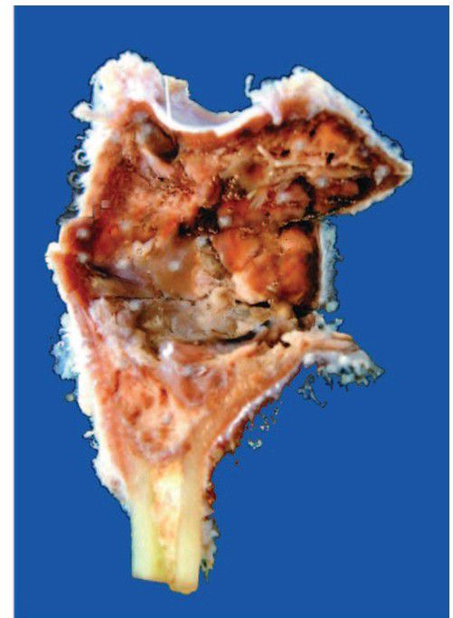 The end of the long bone is expanded due to a cyst. The inner wall of the cyst is tan and haemorrhagic.