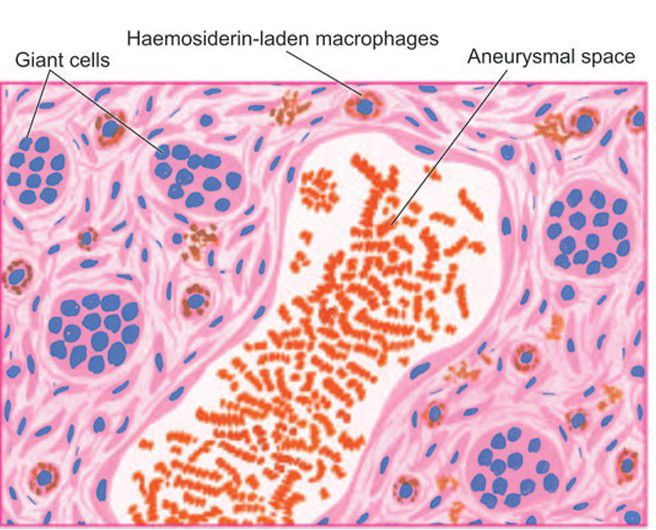 . Histologic hallmark of lesion is presence of aneurysmal spaces filled with blood, partly lined by endothelium and separated by connective tissue septa containing osteoclast-like giant cells along the wall of vascular spaces.