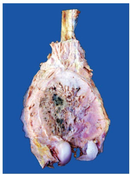 The lower end of the femur shows a bulky expanded tumour in the region of metaphysis sparing the epiphyseal cartilage. Sectioned surface of the tumour shows lifting of the periosteum by the tumour and eroded cortical bone. The tumour is grey-white with areas of haemorrhage and necrosis.
