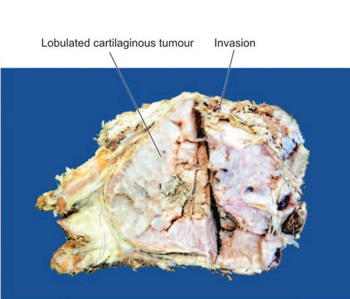 Chondrosarcoma, scapula. The bone is expanded externally due to a gelatinous tumour. Sectioned surface shows lobulated mass with bluish cartilaginous hue infiltrating the soft tissue