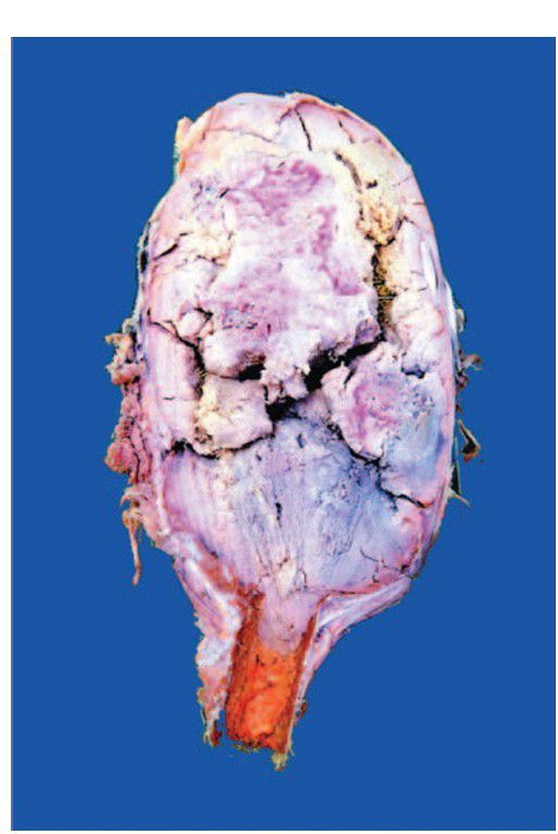 Giant cell tumour (osteoclastoma). The end of the long bone is expanded in the region of epiphysis. Sectioned surface shows circumscribed, dark tan, haemorrhagic and necrotic tumour.