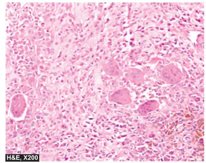 The tumour shows infiltrate of small oval to spindled histiocytes with numerous interspeed multinucleate giant cells lyning in a background of fibrous tissue.