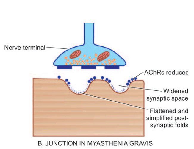 Neuromuscular junction in myasthenia gravis . The junction in MG shows reduced number of AChRs, flattened and simplified postsynaptic folds, a widened synaptic space but a normal nerve terminal.
