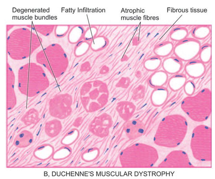 Findings in Duchenne’s muscular dystrophy showing hyaline fibres, fibre degeneration, loss of fibres and replacement by interstitial fibrosis and adipose tissue.