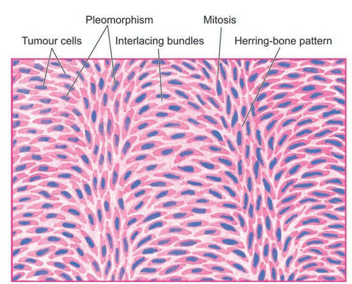 . Microscopy shows a well-differentiated tumour composed of spindle-shaped cells forming interlacing fascicles producing a typical Herring-bone pattern. A few mitotic figures are also seen.