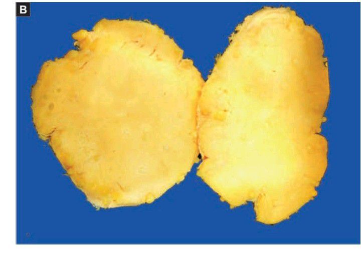The cut surface of the tumour is soft, lobulated, yellowish and greasy.