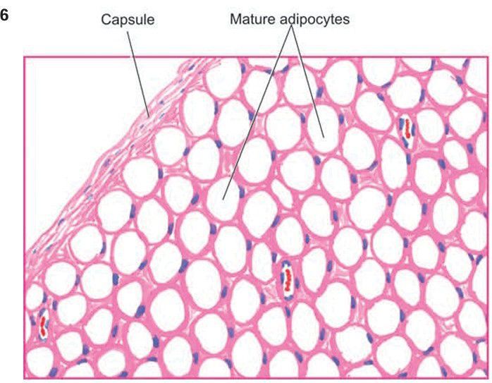 . The tumour shows a thin capsule and underlying lobules of mature adipose cells separated by delicate fibrous septa.