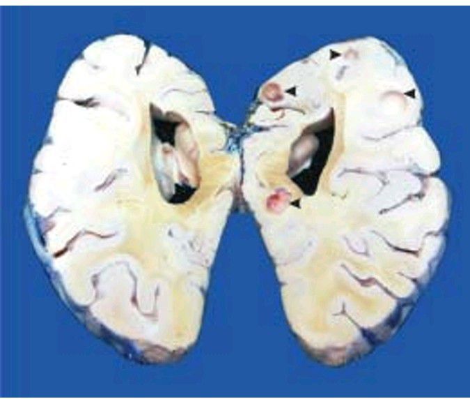 . The sliced surface of the cerebral hemisphere of the brain shows may tiny whitish nodules and cysts about 1 cm in diameter.