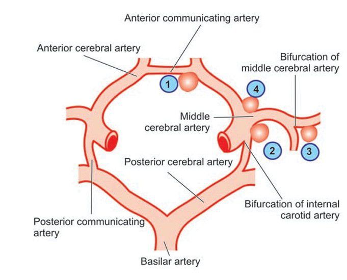 The circle of Willis showing principal sites of berry (saccular) aneurysms. The serial numbers indicate the frequency of involvement.