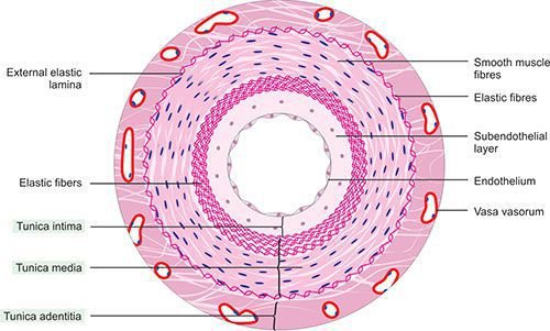 Showing prominent internal elastic lamina in Tunica Itima, External elastic lamina in Tunica media and Vasa vasorum in in Tunica adventitia .