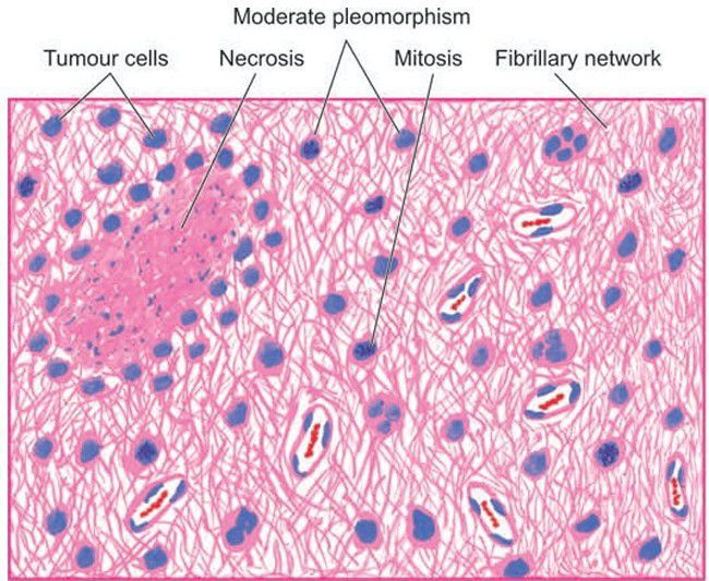 Anaplastic astrocytoma, showing hypercellularity of pleomorphic astrocytic cells, mitoses and vascular proliferation in fibrillary background. Areas of necrosis are also present.