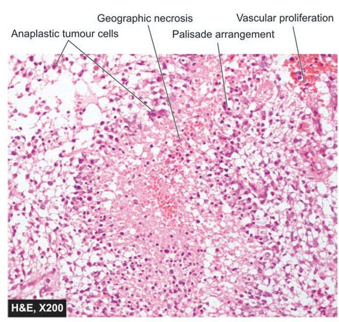 The tumour is densely cellular having marked pleomorphism. Characteristically, the tumour has areas of necrosis which are surrounded by a palisade layer of tumour cells.
