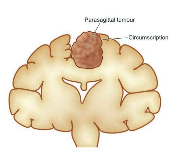 Meningioma, The tumour mass is circumscribed (arrow) with irregular surface convolutions and prominent blood vessels. It is firm in consistency with peripherally adherent thick firm dural tissue. Cut surface of the mass is firm and fibrous.