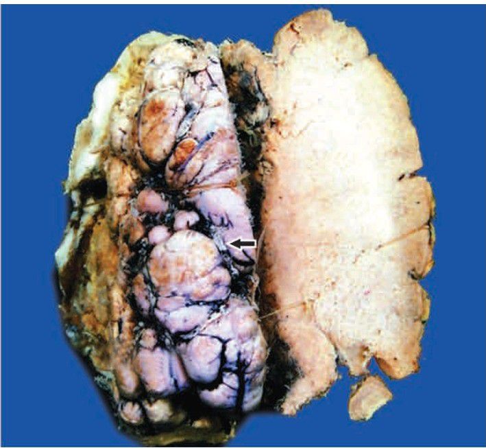 , The tumour mass is circumscribed (arrow) with irregular surface convolutions and prominent blood vessels. It is firm in consistency with peripherally adherent thick firm dural tissue. Cut surface of the mass is firm and fibrous.