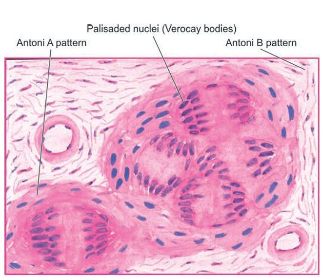 Schwannoma (neurilemmoma), showing whorls of densely cellular (Antoni A) and loosely cellular (Antoni B) areas with characteristic nuclear palisading (Verocay bodies).