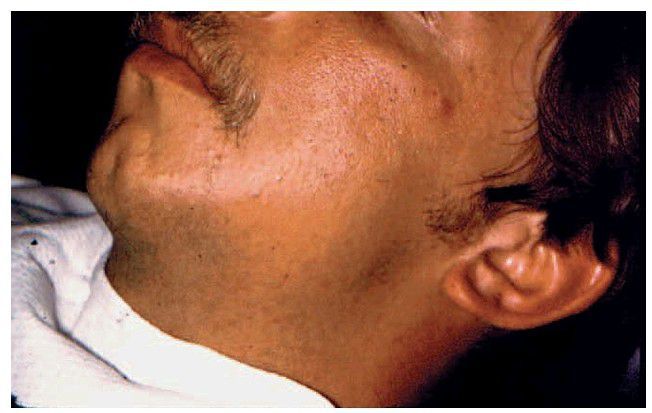 Buccal space swelling associated with an acute periradicular abscess from the mandibular left second molar.
