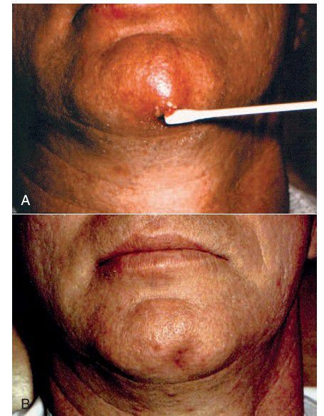 A, A culture is obtained from the drainage from the extraoral sinus tract. B, The healed opening of the extraoral sinus tract 1 month after root canal therapy was completed. Note the slight concavity of the skin in the area of the healed extraoral opening