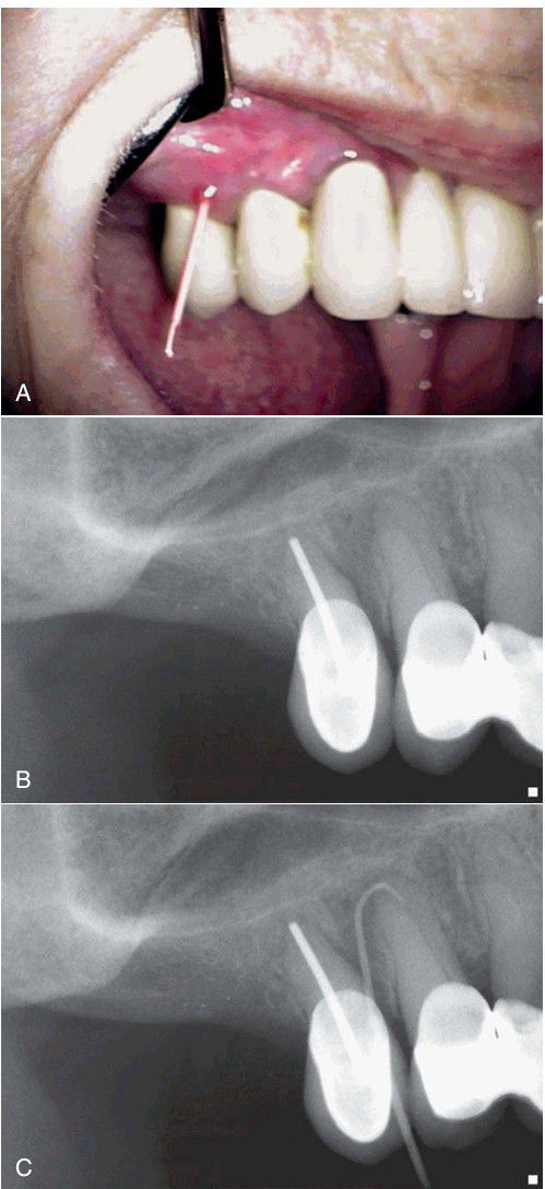 , To locate the source of an infection, the sinus tract can be traced by threading the stoma with a gutta-percha point. B, The radiograph of the area shows an old root canal in tooth #4, and a questionable radiolucent area associated with tooth #5, with no indication of the etiology of the sinus tract. C, After tracing the sinus tract, the gutta-percha is seen to be directed to the source of pathosis, the apex of tooth #5.