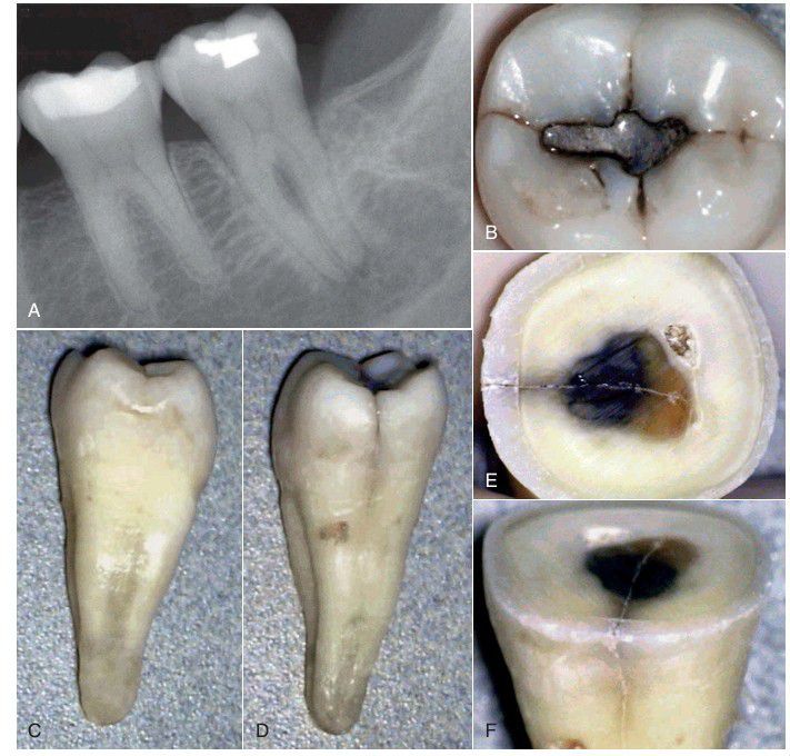 A tooth with minimal or no restoration or caries is unlikely to become nonvital. A, This radiograph of a mandibular second molar shows a restoration that is distant from the pulp chamber, yet the tooth is nonvital and symptomatic. B, On occlusal examination, a slight crack is observed on the distal marginal ridge. C, After extraction, the mesial aspect of the crown and root shows no indication of a fracture. D, However, the distal aspect of the crown and coronal root shows the fracture. E and F, When the crown is sectioned, the crack can be observed to extend well into the pulp chamber.
