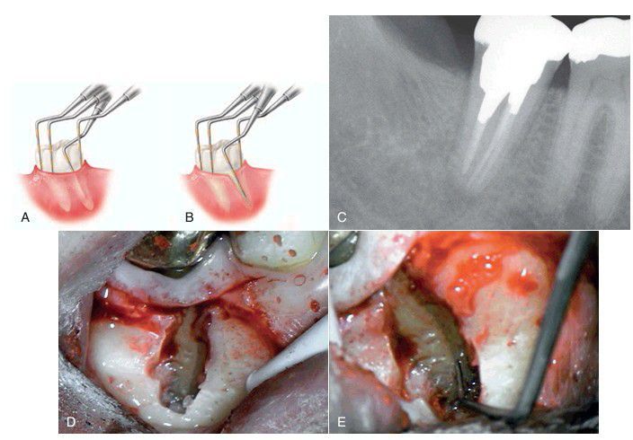 When a narrow, isolated periodontal defect is present, with the adjacent periodontal structures within normal limits, there is typically an associated boney dehiscence with an underlying vertical root fracture beneath (A-B). This mandibular second molar showed this type of defect, as observed on surgical exploration (C-E).