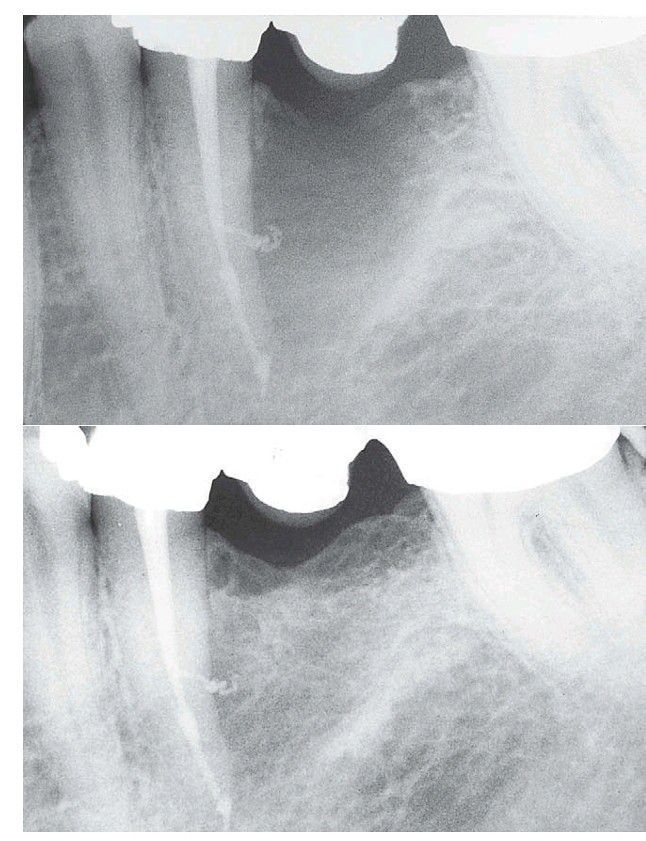 A large, bony defect associated with tooth #20 healed after endodontic therapy. The tooth was nonvital, and no significant peri odontal probing depth indicated pulpal disease.