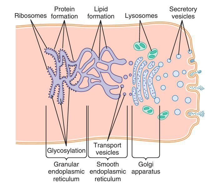 Formation of proteins, lipids, and cellular vesicles by the endoplasmic reticulum and Golgi apparatus.