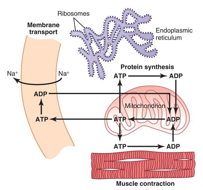 Use of adenosine triphosphate (ATP; formed in the mitochondrion) to provide energy for three major cellular functions: membrane transport, protein synthesis, and muscle contraction. ADP, adenosine diphosphate.