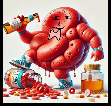 Obese RBC: This reminds you that the focus is on macrocytic anemia, where red blood cells are larger than normal. -Alcohol: The RBC in the picture is depicted as drinking alcohol, representing alcoholism as one of the causes of macrocytic anemia. -Liver-like structure: Found in the abdomen of the RBC, this symbolizes chronic liver disease, which can lead to macrocytic anemia. -Elegant Butterfly: The butterfly shape is associated with the thyroid, hinting at hypothyroidism as another cause of macrocytic anemia. -Bottle of vitamins: The RBC is stepping on a bottle of vitamins, which suggests a vitamin B12 or folate deficiency—both of which are common causes of macrocytic anemia. -Bottle of honey (miele): This is a play on the word “miele” in Italian, representing myelodysplastic syndromes (MDS), a group of hematological conditions that can lead to macrocytic anemia. -RBCs spilling out: At the bottom of the vitamin bottle, there are red blood cells spilling out. The presence of these RBCs should remind you of their precursors, reticulocytes. In fact, reticulocytosis can mimic macrocytic anemia because reticulocytes are larger than mature RBCs and may appear as macrocytic cells.