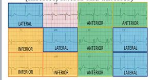 ECG:(1) Lead I +aVL+V5-6.....lateral(LCA). (2)lead II +III+aVF...inferior.....Inferior(RCA). (3)V1-V4.....anterior(Anterior descending artey). ***consider posterior MI look to lead V1-V3 if ST depression and tall R. ****consider RV infract if ST elevation in V4R association with inferior MI