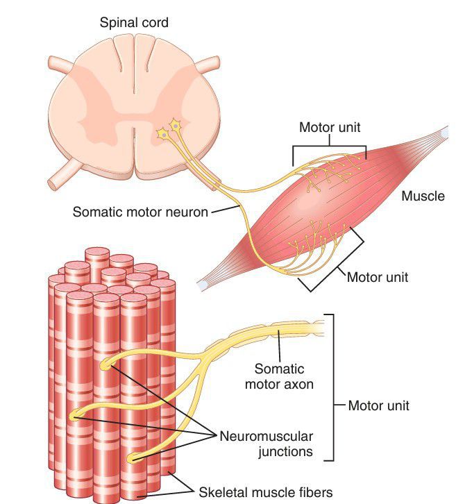 A motor unit consists of a motor neuron and the group of skeletal muscle fibers it innervates. A single motor axon may branch to innervate several muscle fibers that function together as a group. Although each muscle fiber is innervated by a single motor neuron, an entire muscle may receive input from hundreds of different motor neurons.