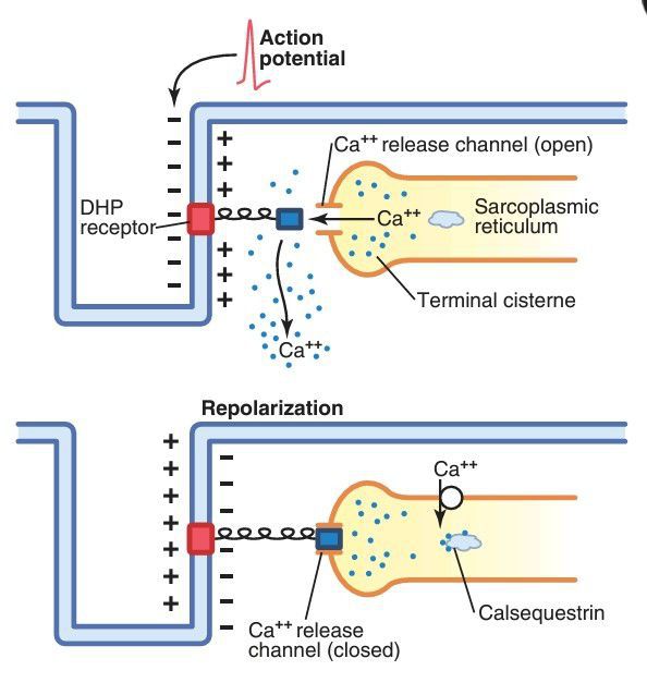 The top panel shows an action potential in the transverse tubule that causes a conformational change in the voltage-sensing dihydropyridine (DHP) receptors, opening the Ca++ release channels in the terminal cisternae of the sarcoplasmic reticulum and permitting Ca++ to rapidly diffuse into the sarcoplasm and initiate muscle contraction. During repolarization (bottom panel), the conformational change in the DHP receptor closes the Ca++ release channels and Ca++ is transported from the sarcoplasm into the sarcoplasmic reticulum by an adenosine triphosphate–dependent calcium pump.